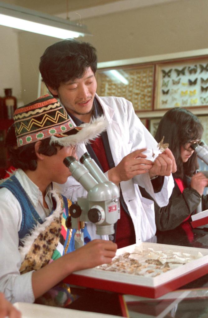 西藏農牧學院農學系老師在輔導藏族學生觀察蝴蝶昆蟲標本。(1991年發(fā))
