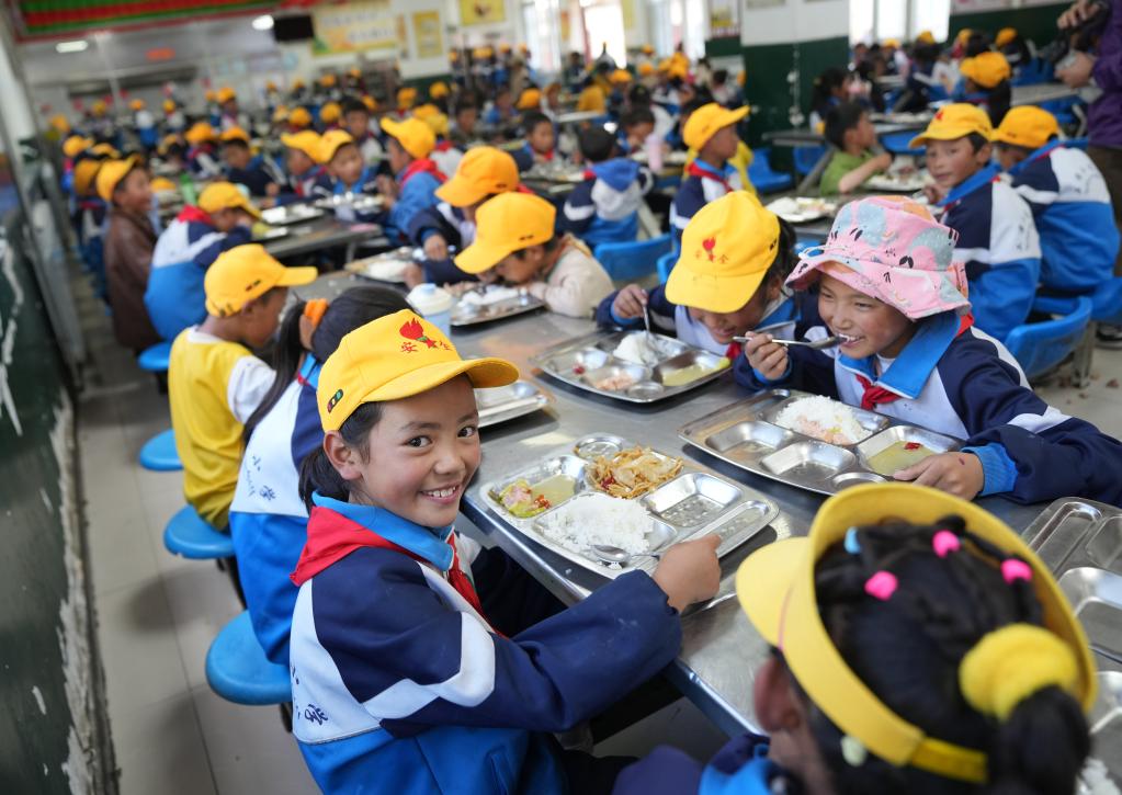 西藏林芝市工布江達縣娘蒲鄉(xiāng)中心小學學生在食堂用餐(2024年9月3日攝)。 新華社記者 晉美多吉 攝