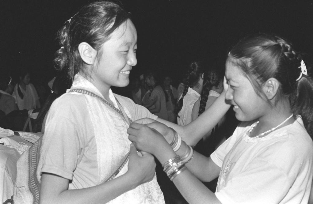 北京西藏中學首批93名藏族高中畢業(yè)生乘火車離京返藏。1991年入校的次仁卓嘎來到北京火車站為姐姐卓嘎送行。卓嘎是位品學兼優(yōu)的好學生。臨別前,她勉勵妹妹好好學習(1992年7月13日攝)。