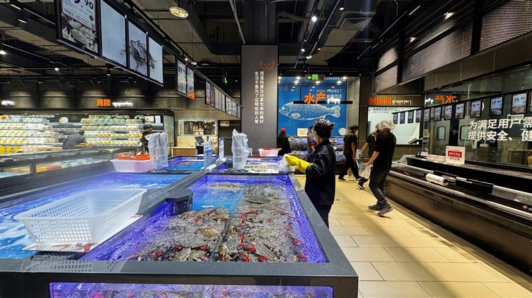 肉禽區(qū)在保留原有優(yōu)質(zhì)商品基礎(chǔ)上,新增黑豬系列冷鮮肉、品牌冷鮮進(jìn)口牛肉、原切牛排等高品質(zhì)商品,同時(shí)引入藏香豬冷鮮肉、牦牛肉、本地藏雞蛋等特色商品。海鮮區(qū)域在保留本地淡水魚的基礎(chǔ)上,加大明蝦、鮑魚、扇貝等大海鮮的占比,同時(shí)帝王蟹、波龍、面包蟹、珍寶蟹組成“進(jìn)口四大金剛”,滿足顧客對高端海鮮的需求。針對季節(jié)需求,還推出優(yōu)質(zhì)大閘蟹等時(shí)令商品,滿足消費(fèi)者對優(yōu)質(zhì)蛋白的需求。