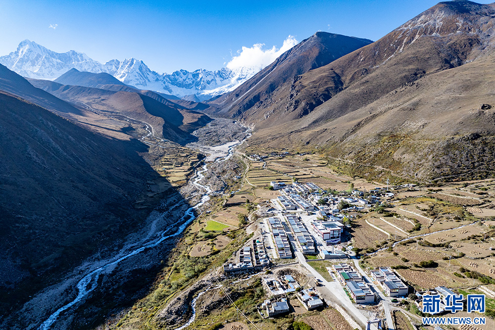 10月11日拍攝的遠(yuǎn)處庫拉崗日雪山與西藏山南市洛扎縣措玉村(無人機(jī)照片)。新華網(wǎng) 旦增努布 攝