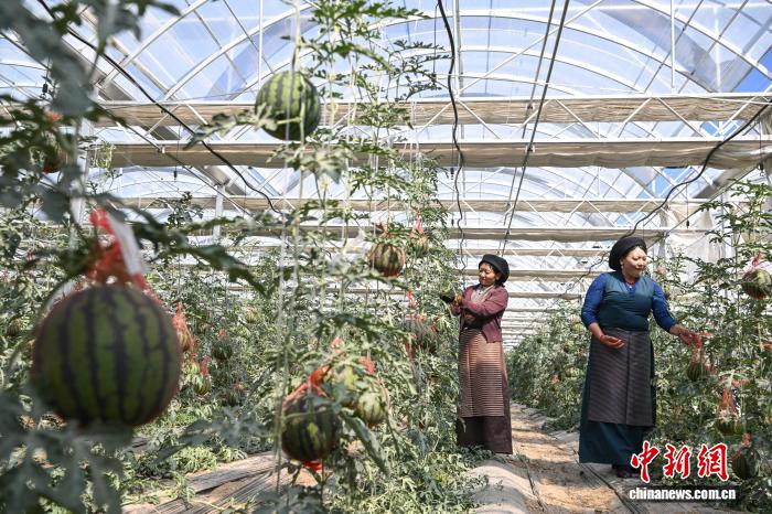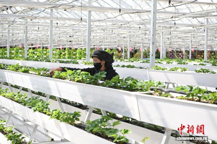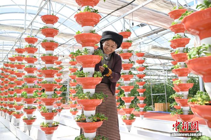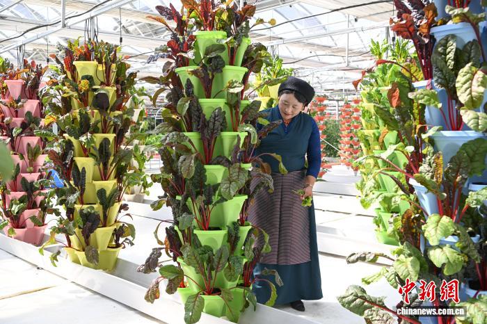 圖為當?shù)毓と嗽谀窆たh現(xiàn)代化農(nóng)業(yè)示范園里工作。中新社記者 貢嘎來松 攝