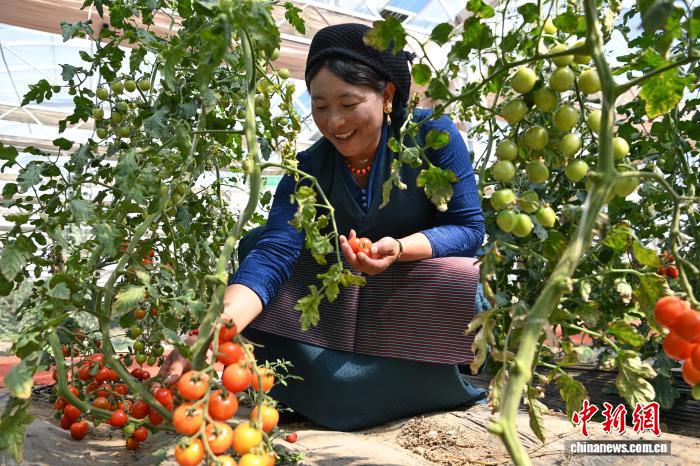 圖為當?shù)毓と嗽谀窆たh現(xiàn)代化農(nóng)業(yè)示范園里采摘圣女果。中新社記者 貢嘎來松 攝