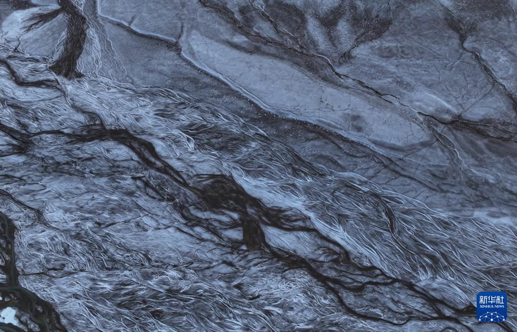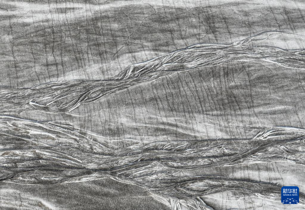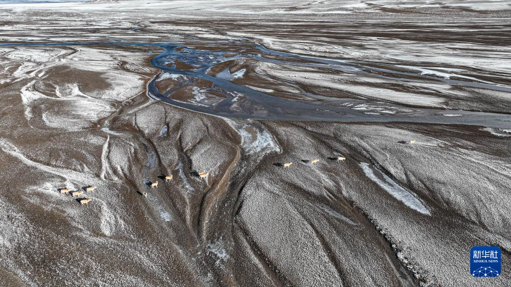 藏羚羊排隊(duì)走過甜水河河床,留下整齊的印跡(6月15日攝,無人機(jī)照片)。新華社記者 晉美多吉 攝