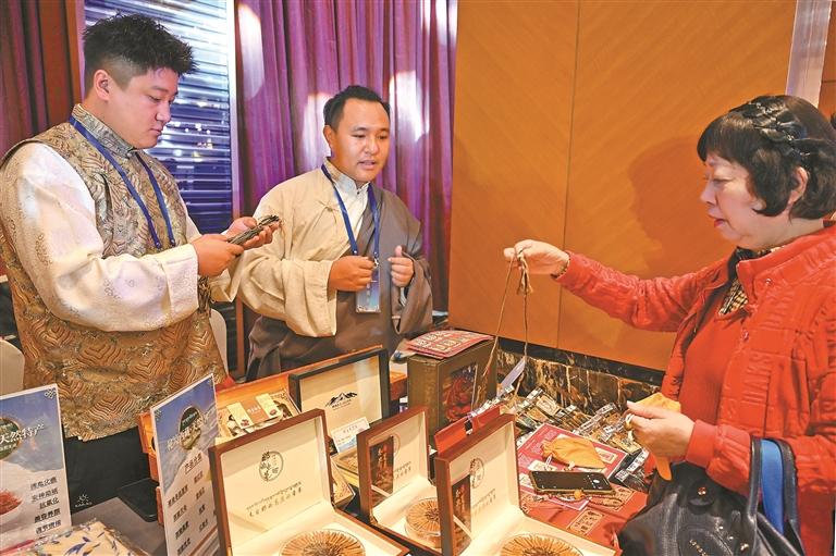 第八屆中國(guó)國(guó)際進(jìn)口博覽會(huì)西藏自治區(qū)招商引資推介會(huì)上,顧客正在選購(gòu)商品。記者 王敏 索朗瓊珠 嘎松卓瑪 攝